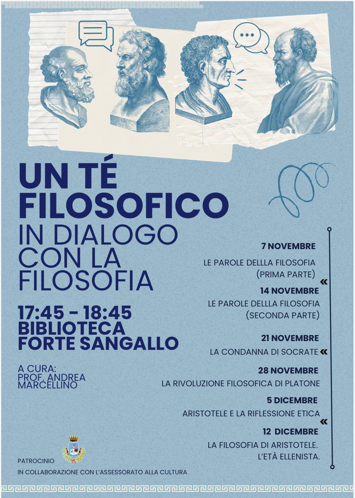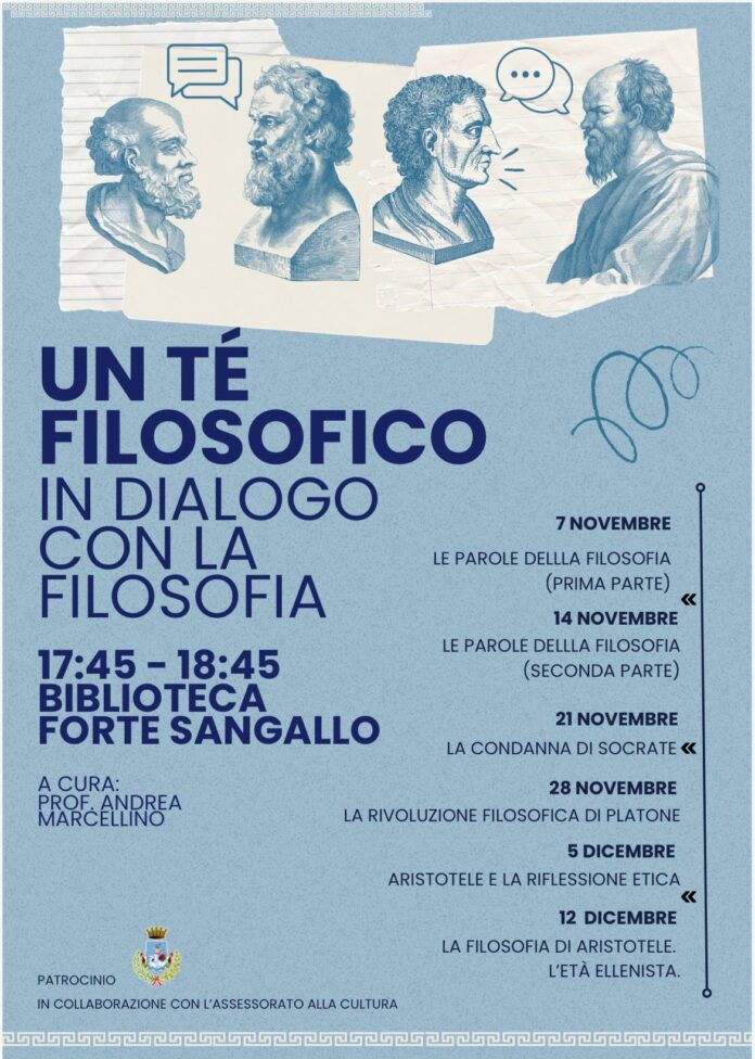L’assessorato alla cultura guidato da Roberto Imperato ha accolto la proposta di un progetto culturale gratuito, presentato dal professore Andrea Marcellino, che si articola in sei appuntamenti ospitati presso la Biblioteca del Forte Sangallo di Nettuno.Si tratta della rassegna “Un tè filosofico… in dialogo con la filosofia”.
