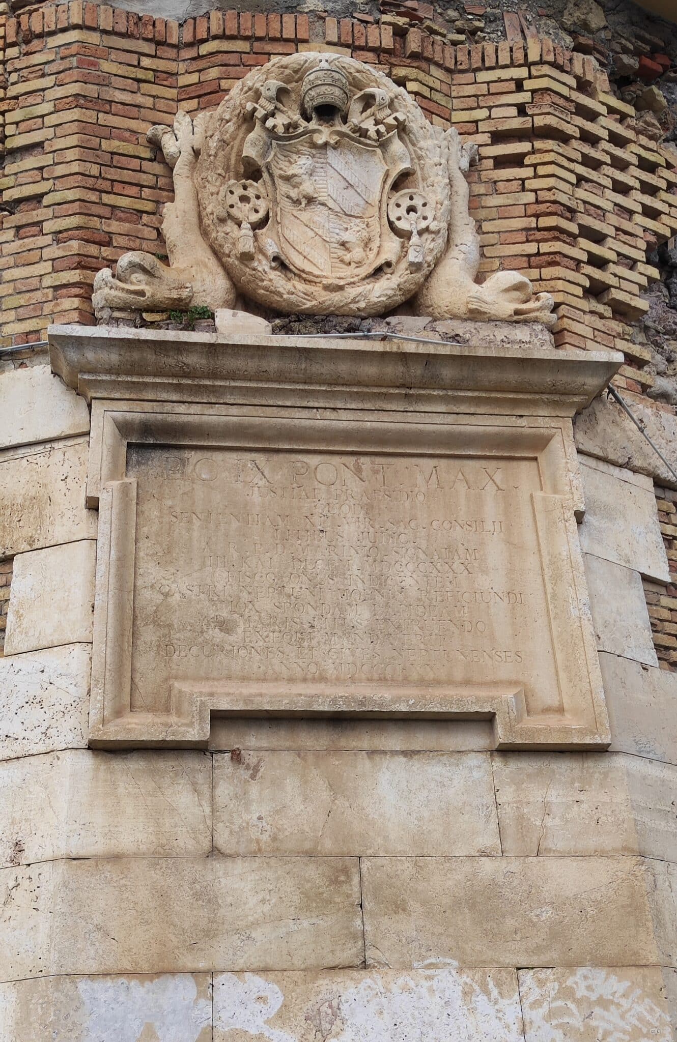 La grande lapide dedicata a Pio IX Pontefice massimo, che svetta sulle mura del Borgo medievale di Nettuno lato porto, ha bisogno di essere restaurata. Difficile infatti leggere l’iscrizione incisa sul marmo. Pensiamo non sia un’operazione molto costosa da affrontare. Il suo restauro potrebbe contribuire a rendere più comprensibile la storia della città sia ai nettunesi sia ai turisti.