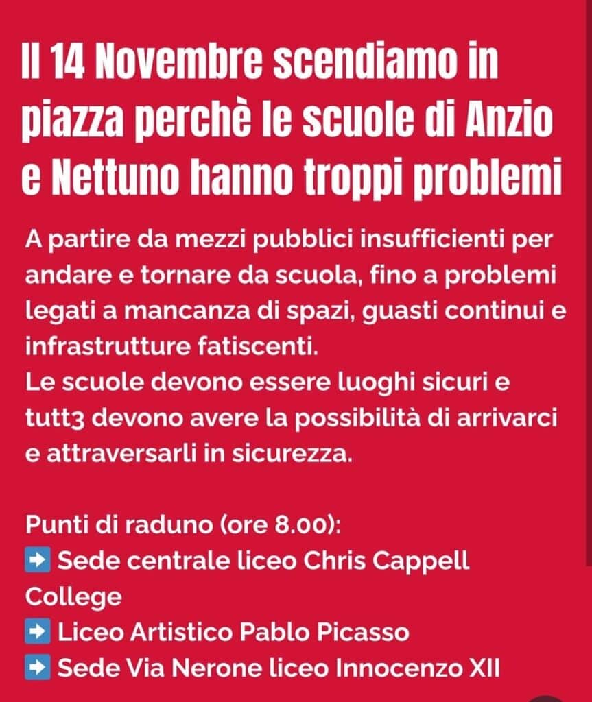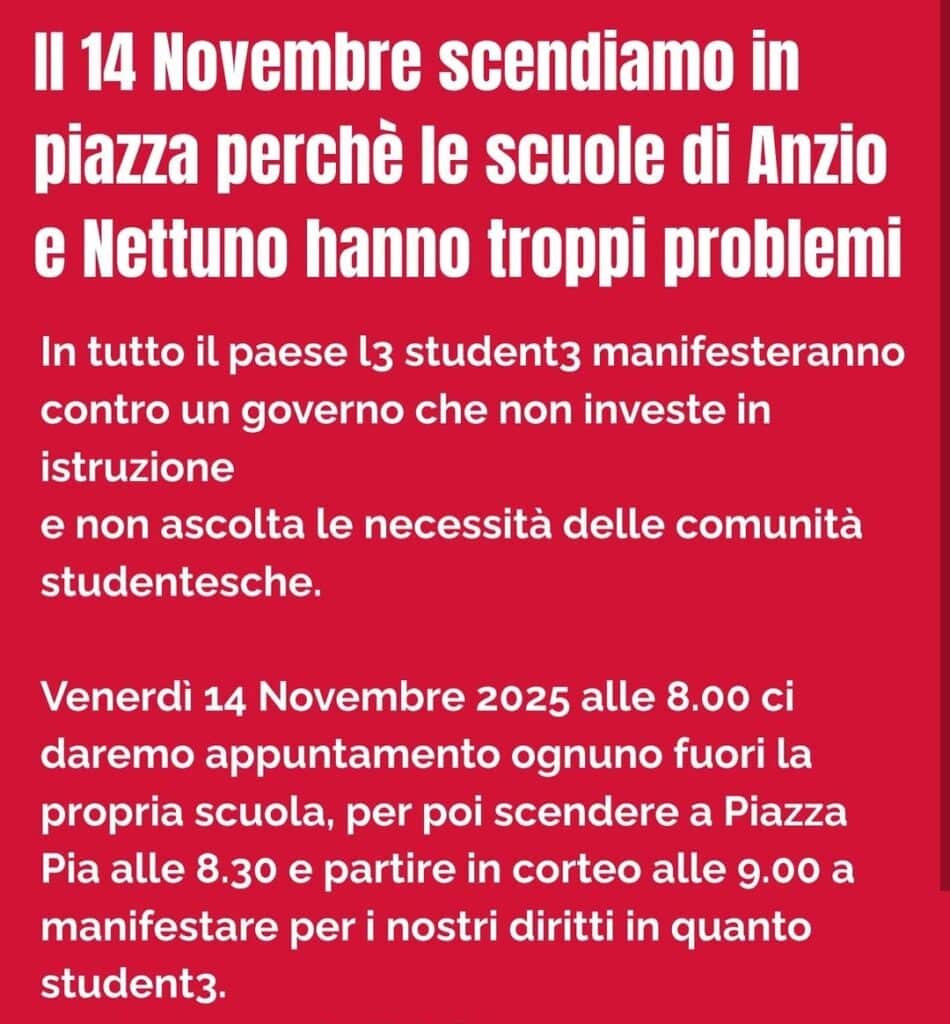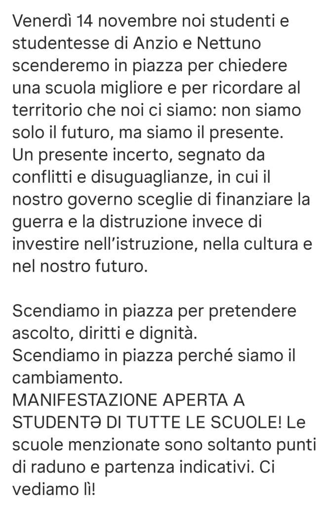 HomeAttualitàAnzio. Venerdì 14, studenti e studentesse in piazza per chiedere una scuola... Attualità Anzio. Venerdì 14, studenti e studentesse in piazza per chiedere una scuola migliore By Redazione 12 Novembre 2025 0 0 FacebookTwitterPinterestWhatsApp Appuntamento ore 9,00 piazza Piazza Pia Anzio *Le notizie del quotidiano inliberauscita sono utilizzabili, a condizione di citare espressamente la fonte quotidiano inliberauscita e l’indirizzo https://inliberauscita.it FacebookTwitterPinterestWhatsApp Articolo precedenteNettuno, “Anime sul mare”: musica, pittura e memoria al Forte Sangallo Redazionehttp://www.inliberauscita.itPeriodico telematico di informazione fondato il 16 giugno 2011 Registrazione presso il tribunale ordinario di Velletri n°12/2011 Ultime Notizie Nettuno, “Anime sul mare”: musica, pittura e memoria al Forte Sangallo 12 Novembre 2025 Ardea, armi e munizioni detenute illegalmente, arrestato 46enne dai carabinieri di Tor San Lorenzo 12 Novembre 2025 Nettuno, Sequestrato bar in centro: ritrovo di persone ‘note’ e alcol a minori. Scatta il provvedimento del Questore 11 Novembre 2025 Attentato a Ranucci, la Procura chiede analisi sulle 40 telecamere di Campo Ascolano 11 Novembre 2025 Sagra d’Autunno e dei Sapori di Nettuno, un successo oltre la pioggia 11 Novembre 2025 Carica altri