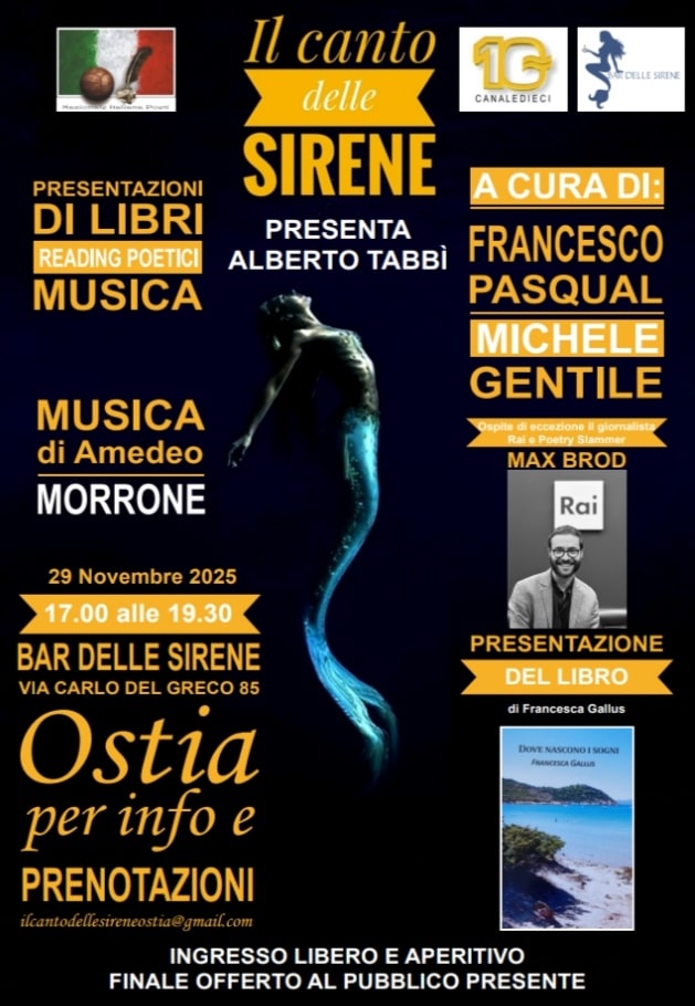 il prossimo 29 novembre con inizio alle ore 17, presso i locali del Bar delle Sirene a Ostia Lido, verrà proposto l’ottavo incontro del ” Canto delle Sirene” format culturale della Nazionale Italiana Poeti curato dai poeti Michele Gentile e Francesco Pasqual