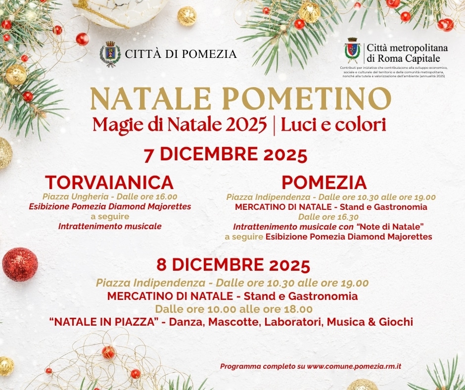 Dal 5 dicembre 2025 al 6 gennaio 2026 Pomezia e Torvajanica diventano il cuore pulsante delle feste con “Natale Pometino 2025”, un ricco programma di iniziative promosso dal Comune di Pomezia con il sostegno di Regione Lazio e Città metropolitana di Roma Capitale.