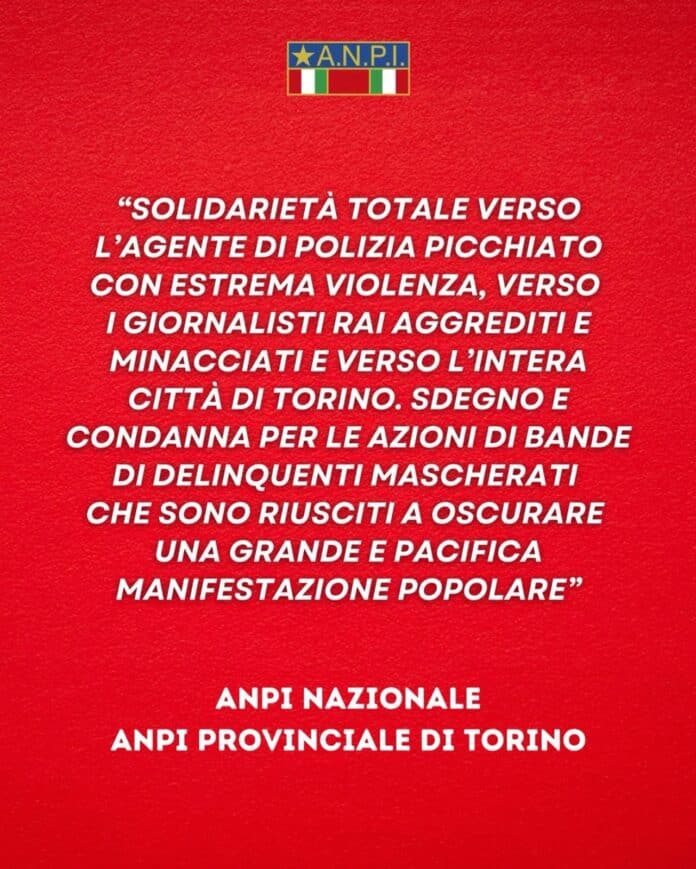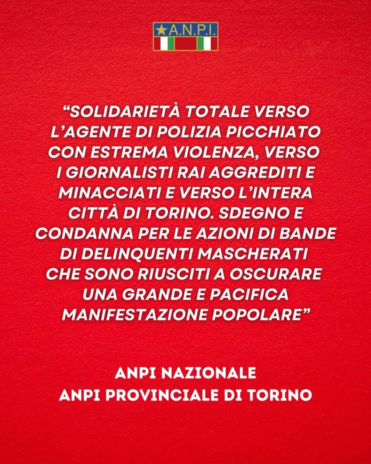 L’ANPI (Associazione Nazionale Partigiani d’Italia), sia a livello nazionale che provinciale (Torino), ha espresso condanne ferme nei confronti di episodi violenti avvenuti nel capoluogo piemontese.