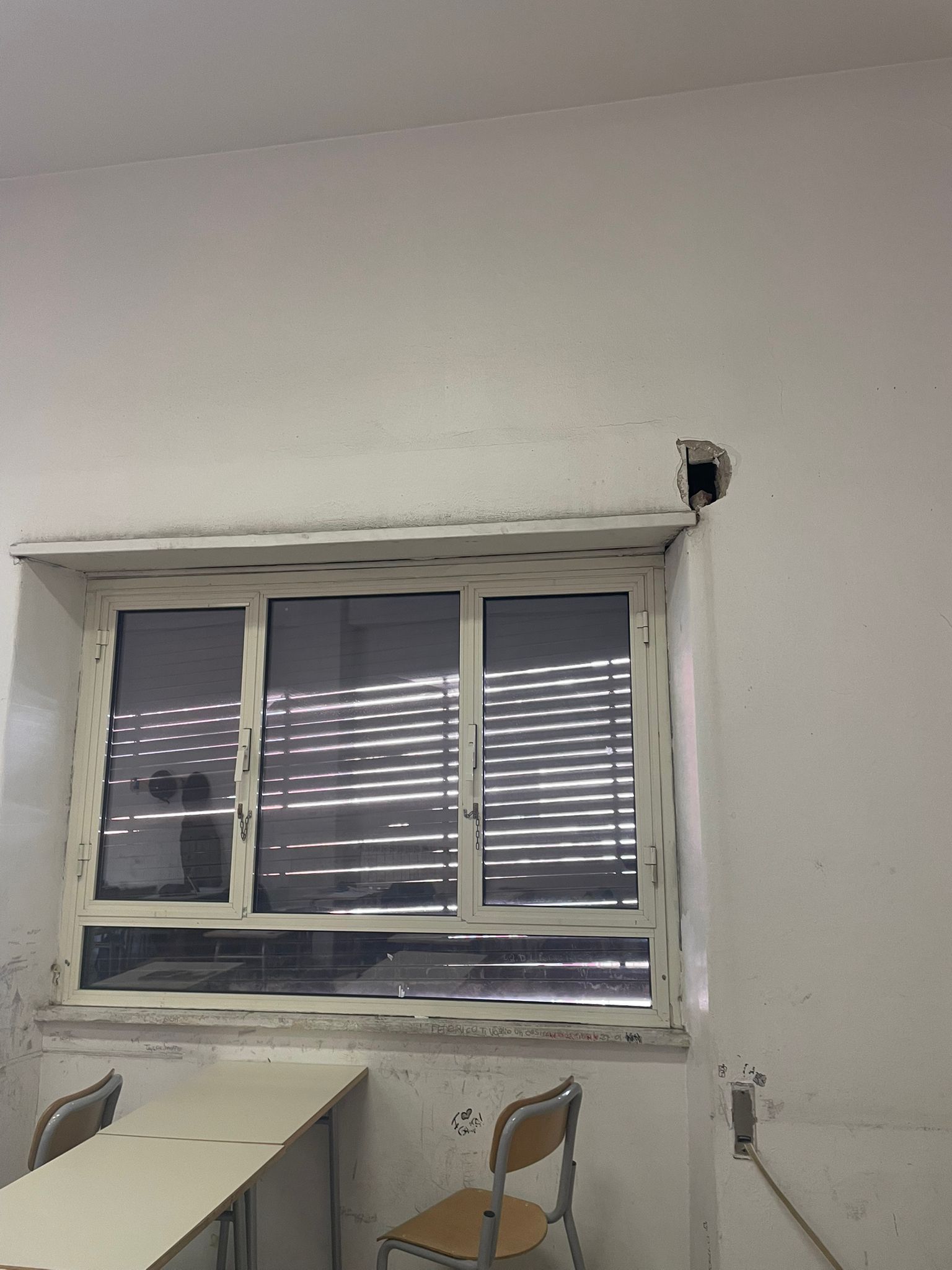È successo questa mattina al Chris Cappell College di Anzio: mentre alcun3 student3 stavano cercando di aprire una tapparella, dei pezzi di muro si sono staccati e sono caduti all’interno dell’aula.