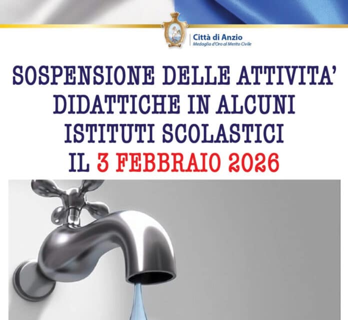 Il sindaco di Anzio, Aurelio Lo Fazio, a tutela della pubblica incolumità e della salute pubblica, ha firmato l’ordinanza n. 6/2026 disponendo la sospensione delle attività didattiche per la giornata di oggi – 3 febbraio – negli istituti scolastici ricadenti nell’area interessata dall’interruzione improvvisa del flusso idrico.