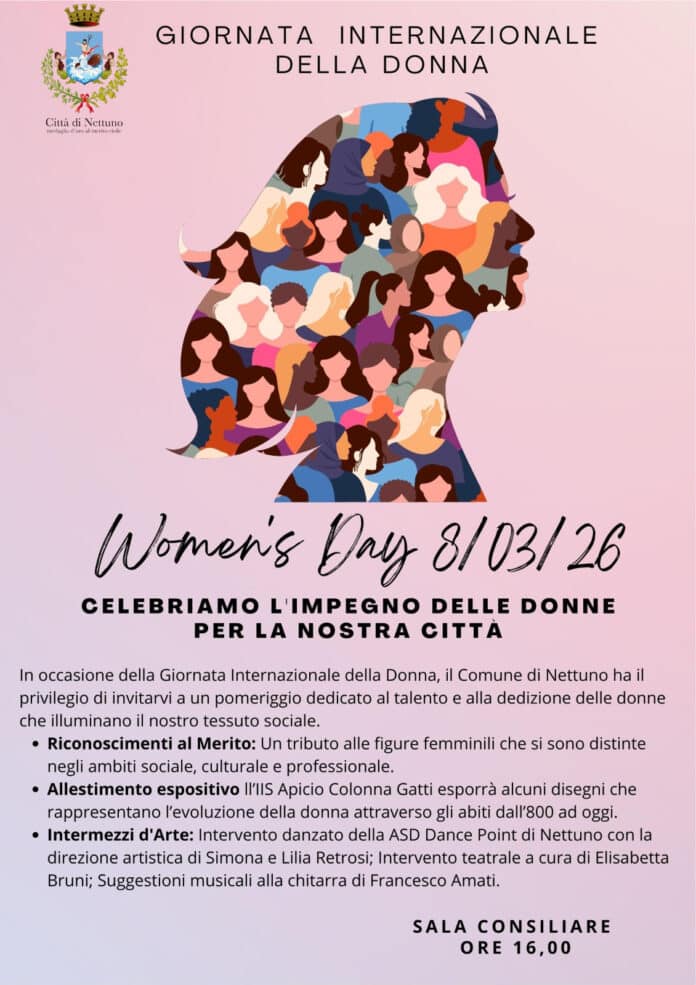 Domenica 8 marzo, in occasione della Giornata internazionale della Donna, il Comune di Nettuno ha organizzato un evento, alle 16, presso la Sala consiliare dell’Ente in via Giacomo Matteotti, per dedicare un pomeriggio di riflessione sul tema dei diritti, dell’uguaglianza e del talento del genere femminile che incide in maniera positiva sul nostro tessuto sociale.