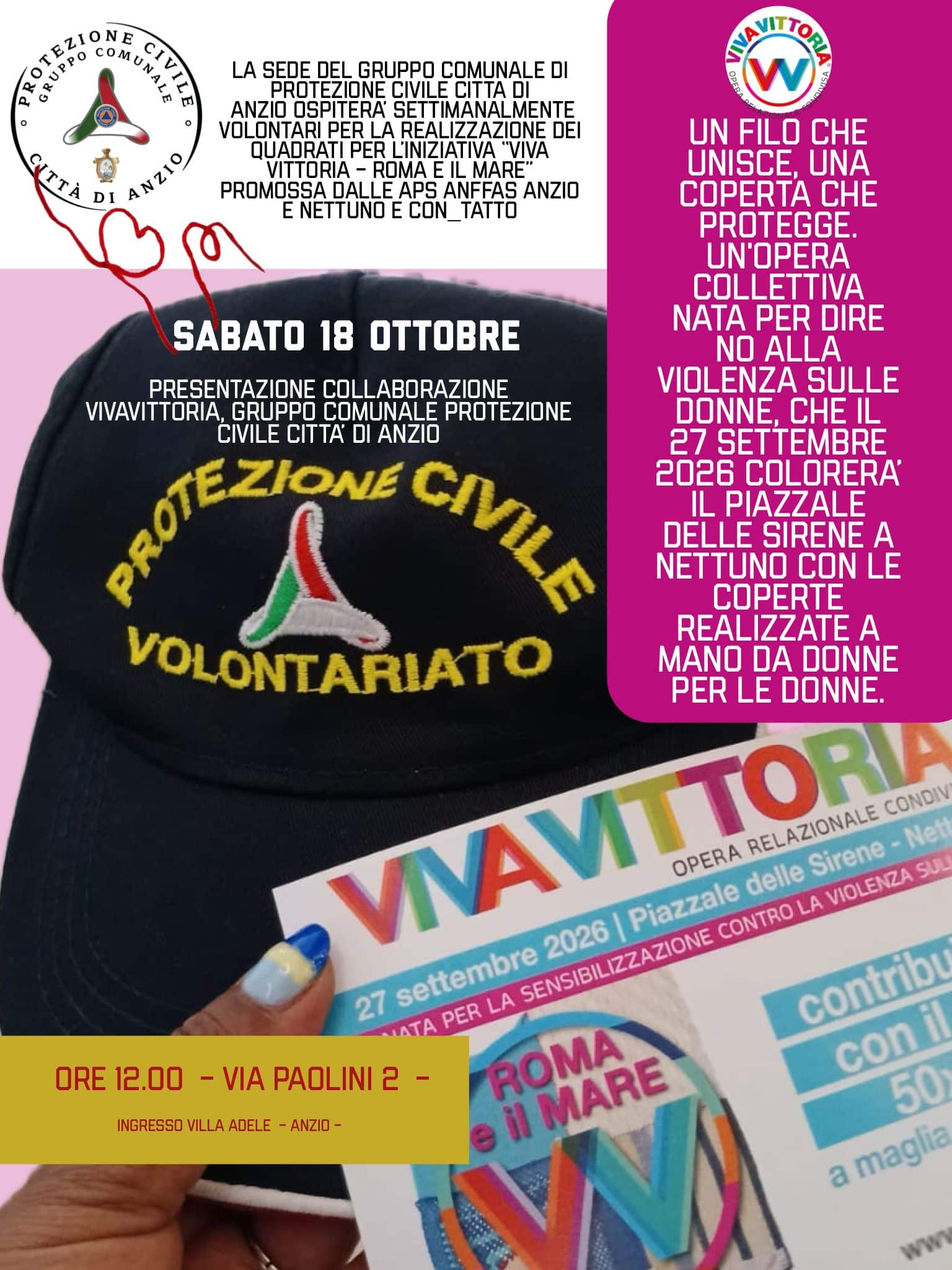 Sabato 18 ottobre è in programma alle ore 12.15 la presentazione della collaborazione del Gruppo comunale di Protezione Civile Cittá di Anzio con il progetto VivaVittoria. Un filo che unisce, una coperta che protegge. Un’opera collettiva nata per dire no alla violenza sulle donne, che il 27 settembre 2026 colorerà il piazzale delle Sirene a Nettuno con le coperte realizzate a mano da donne per le donne.