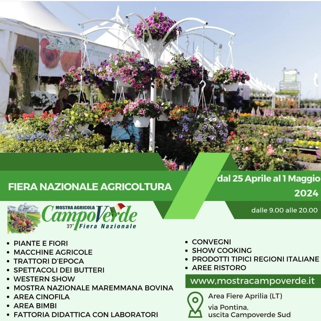 La fiera, organizzata dalla Tre M, è diventata negli anni un appuntamento imperdibile. La Mostra Agricola CampoVerde, con più di 400 gli stand dei settori merceologici rappresentati, legati all’agricoltura, alla floricoltura e all’innovazione, oltre all’enogastronomia e ai prodotti tipici delle regioni italiane, vede il patrocinio della Regione Lazio, della Provincia di Latina, del Comune di Aprilia, della Camera di Commercio Latina-Frosinone, della Camera di Commercio Italo Orientale e dell’Agenzia Regionale per lo Sviluppo e l’Innovazione dell’Agricoltura del Lazio (Arsial).