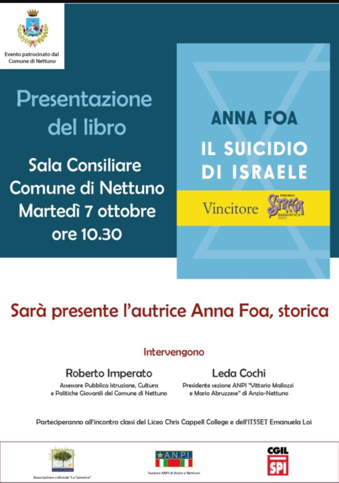 Si terrà il prossimo martedì, 7 ottobre, alle ore 10.30, presso la sala consiliare del Comune di Nettuno, la presentazione del libro della storica Anna Foa “Il suicidio di Israele”, edito da Laterza. Sarà presente l’autrice.