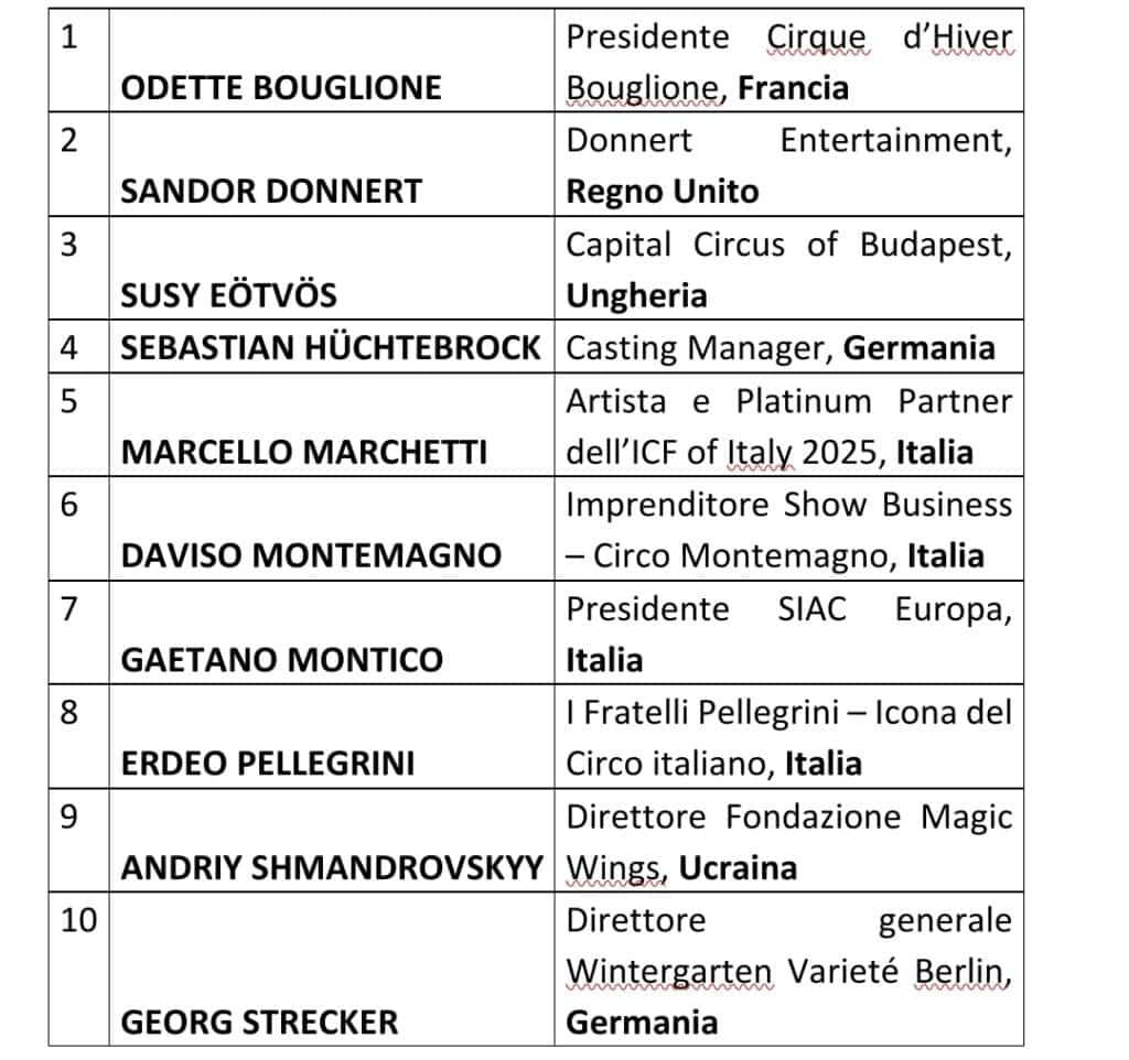 Sono vere “Stelle del Circo” le personalità chiamate a far parte della prestigiosa Giuria Tecnica Internazionale che dovrà assegnare gli ambiti premi della quarta edizione dell’Italian Circus Talent Festival: sono figure note a chiunque si occupi di Circo poiché coinvolte ai massimi livelli nel panorama dell’imprenditorialità, dell’arte o delle politiche di settore. Per i giovani artisti ammessi alla competizione, esibirsi di fronte alla Giuria Tecnica Internazionale può rappresentare una straordinaria opportunità per il proprio futuro artistico e lavorativo.