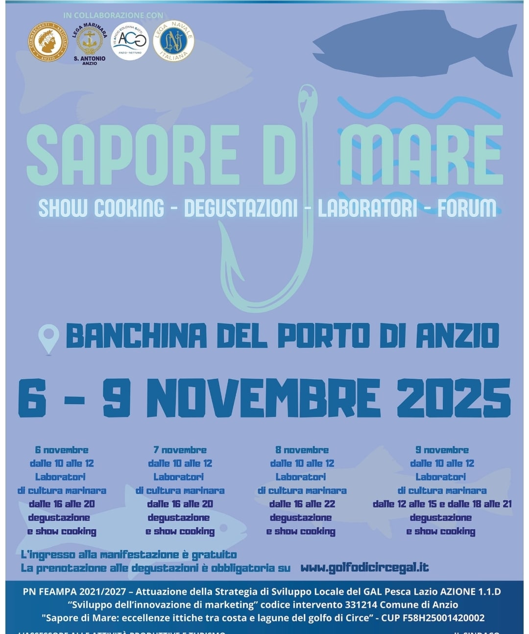 L’evento si svolge in una tensostruttura sul molo (zona cooperative/asta del pesce) e si realizza in sinergia con Gal, Regione Lazio, Associazione commercianti e ristoratori, Guardia costiera, Lega navale, Istituto alberghiero “Apicio Colonna Gatti”, Istituto nautico “Marcantonio Colonna”, Lega marinara Sant’Antonio.