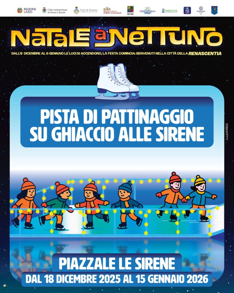 Dal 18 dicembre e fino al 15b gennaio sarà realizzata la pista di pattinaggio sul ghiaccio a piazzale delle Sirene sul Lungomare di Nettuno, a cura della Proloco Forte Sangallo.