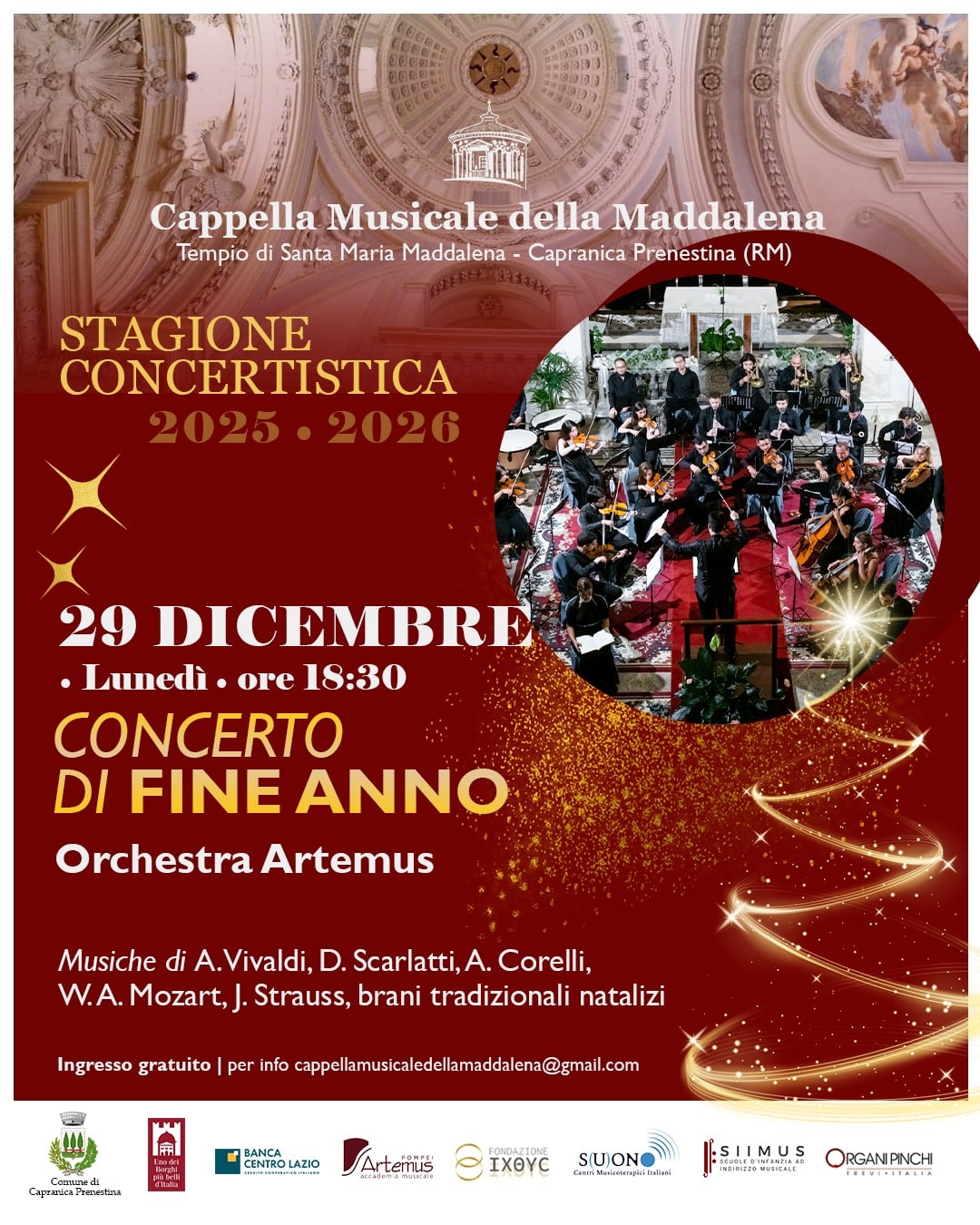Sarà L’Orchestra Artemus ad essere protagonista nel tradizionale Concerto di fine anno presso il Tempio della Maddalena a Capranica Prenestina (Roma) il 29 Dicembre alle ore 18.30. Fondata a Pompei nel 2017 L’Orchestra Artemus si pone sin da subito l’obiettivo di creare una sinergia tra la musica attiva e la valorizzazione di giovani talenti, spaziando dal repertorio sinfonico a quello sacro. Una realtà ormai consolidata nel panorama del nostro Paese. Particolarmente attiva in Campania con sette stagioni concertistiche, distinguendosi come “Eccellenza Pompeiana” in occasione del Pompei Music Fest ( 2019). Nel 2023 aggiunge un ulteriore tassello al suo straordinario percorso tenendo una serie di concerti di Musica Sacra presso il Pontificio Santuario di Pompei per le celebrazioni della ricorrenza dei 150 anni dall’arrivo di Bartolo Longo fondatore della città (2023). L’Esibizione che si inserisce all’interno del nutrito Cartellone di eventi che anima ogni anno il periodo natalizio è articolato in tre registri musicali. Nella prima sezione verranno eseguiti musiche di Vivaldi, Corelli e Respighi, un repertorio prettamente italiano di orchestra d’archi, avremo poi l’esecuzione di brani tradizionali natalizi per concludere con brani tipici del repertorio della famiglia Strauss come da tradizione Viennese. L’iniziativa fortemente voluta da Don Davide Martinelli rappresenta il coronamento di un altro anno segnato dalla sua lungimirante attività a servizio della Comunità di Capranica Prenestina.