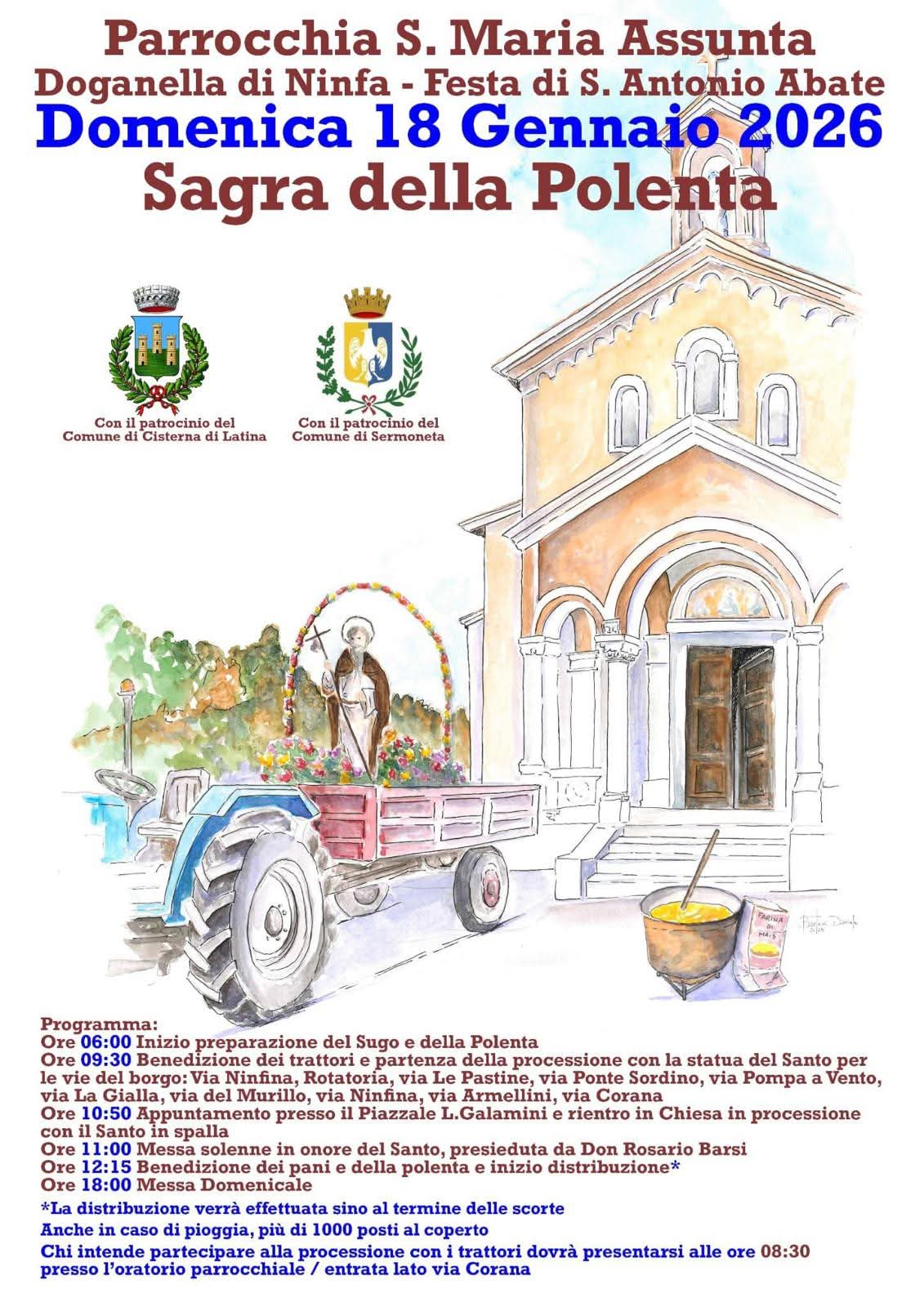 La festa, che gode del patrocinio dei Comuni di Cisterna e Sermoneta, è in programma per domenica 18 gennaio 2026 a partire dalle ore 9.30.