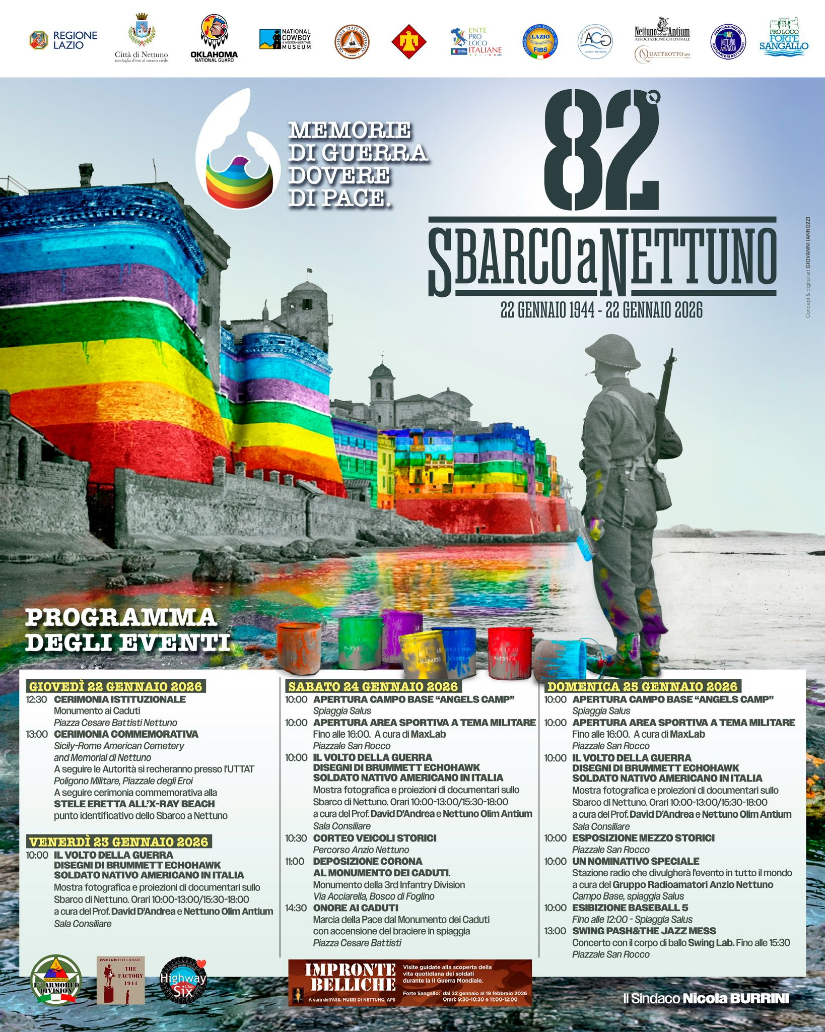 Nettuno si prepara a vivere un momento di profonda memoria collettiva con “Lo Sbarco a Nettuno”, la manifestazione ufficiale dedicata all’82° Anniversario dello Sbarco Alleato, in programma tra il 22 e il 25 gennaio 2026, con iniziative culturali, commemorative, educative e sportive diffuse sul territorio.