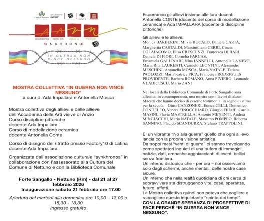 “La scelta del tema su cui lavorare per la Mostra annuale dell’Accademia – spiegano la Maestra Ada Impallara e i suoi allievi – passa sempre da una riflessione collettiva. Quella del 2026 non poteva che cogliere e raccogliere l’ inquietante “spirito dei tempi” in cui siamo spettatori di una bufera di immagini, notizie, dati, cronache agghiaccianti di eventi bellici senza frontiera, dall’Europa all’Asia, all’Africa all’America”