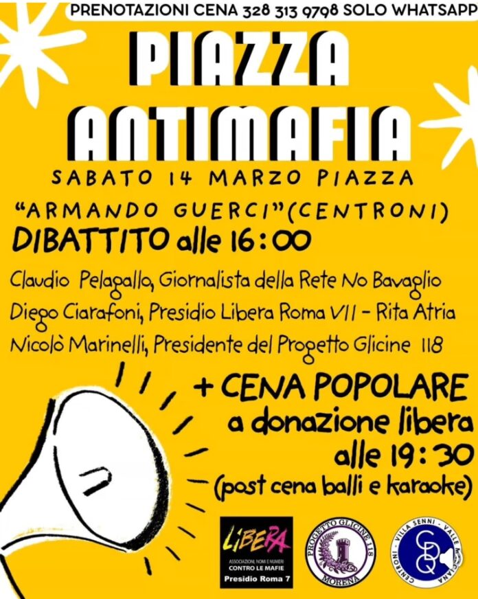 Sabato 14 marzo la piazza “Armando Guerci”, nel quartiere Centroni, ospiterà “Piazza Antimafia”, un’iniziativa pubblica dedicata alla memoria delle vittime delle mafie e all’informazione sui fenomeni mafiosi nella città di Roma.