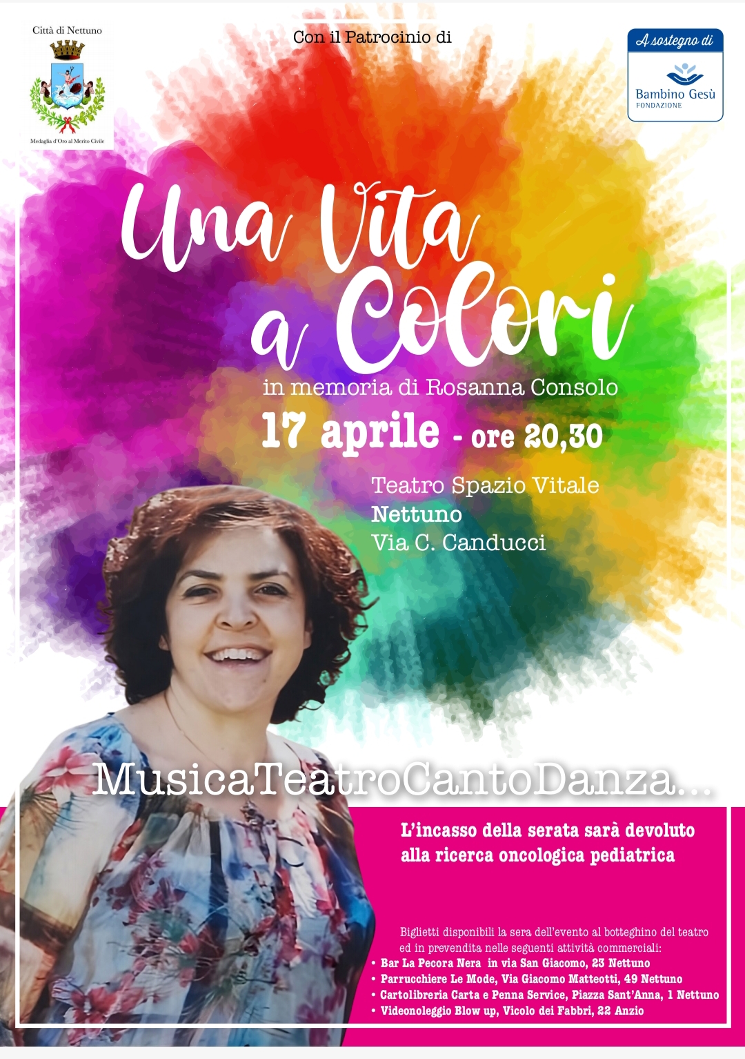 Si terrà il 17 aprile al Teatro Spazio Vitale con il patrocinio del Comune di Nettuno l’evento di beneficenza “Una vita a colori”: una serata di musica, teatro, danza, arte e canto in memoria di Rosanna Consolo, nella ricorrenza della sua data di nascita. La serata vedrà alternarsi sul palco amici e amiche, artisti del nostro territorio, che daranno così il proprio contributo a una causa  importante: il ricavato della vendita dei biglietti (costo 10 euro) sarà devoluto infatti completamente alla ricerca oncologica pediatrica della Fondazione Ospedale Pediatrico Bambino Gesù.