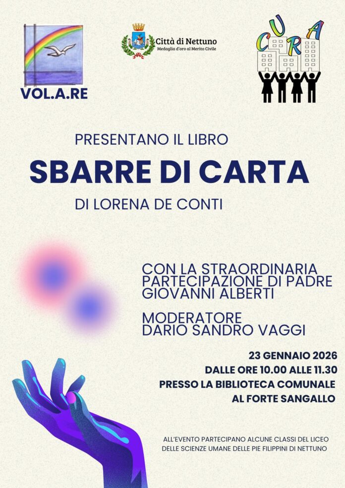 Il 23 gennaio, con il patrocinio del Comune di Nettuno, presso la Biblioteca del Forte Sangallo, dalle l 10 alle 11.30, si terrà la presentazione del libro Sbarre di carta di Lorena De Conti.