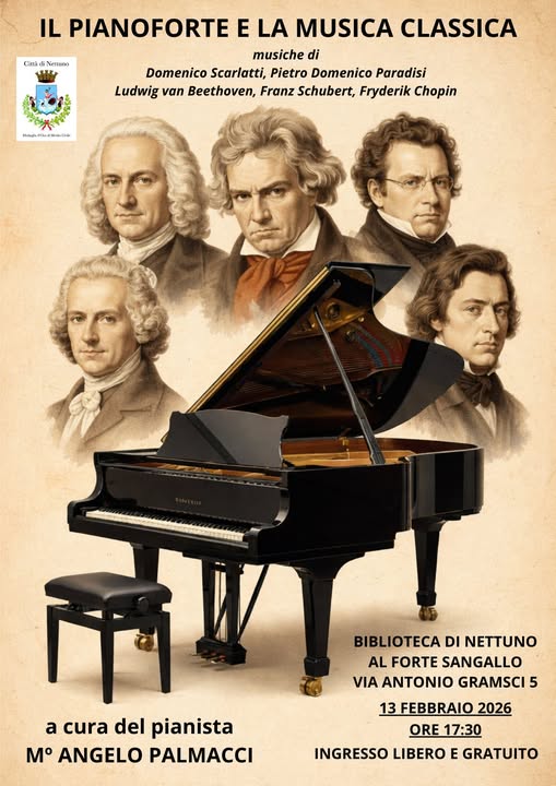Venerdì 13 febbraio alle 17:30, presso la Biblioteca comunale di Nettuno al Forte Sangallo, si terrà il concerto di musica classica “Il Pianoforte e la Musica Classica”, ideato e interpretato dal pianista Angelo Palmacci.
