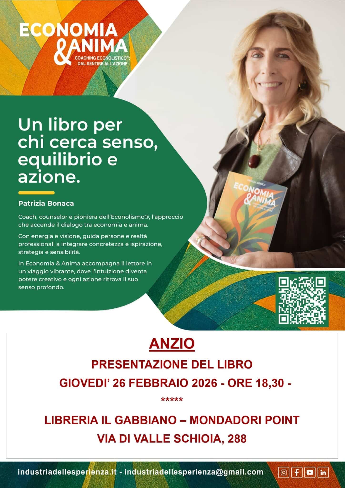 giovedì 26 febbraio alle ore 18.30, presso la Libreria Il Gabbiano – Mondadori (Viale di Valle Schioia, 288), si terrà la presentazione del libro Economia & Anima, con la partecipazione dell’autrice Patrizia Bonaca.