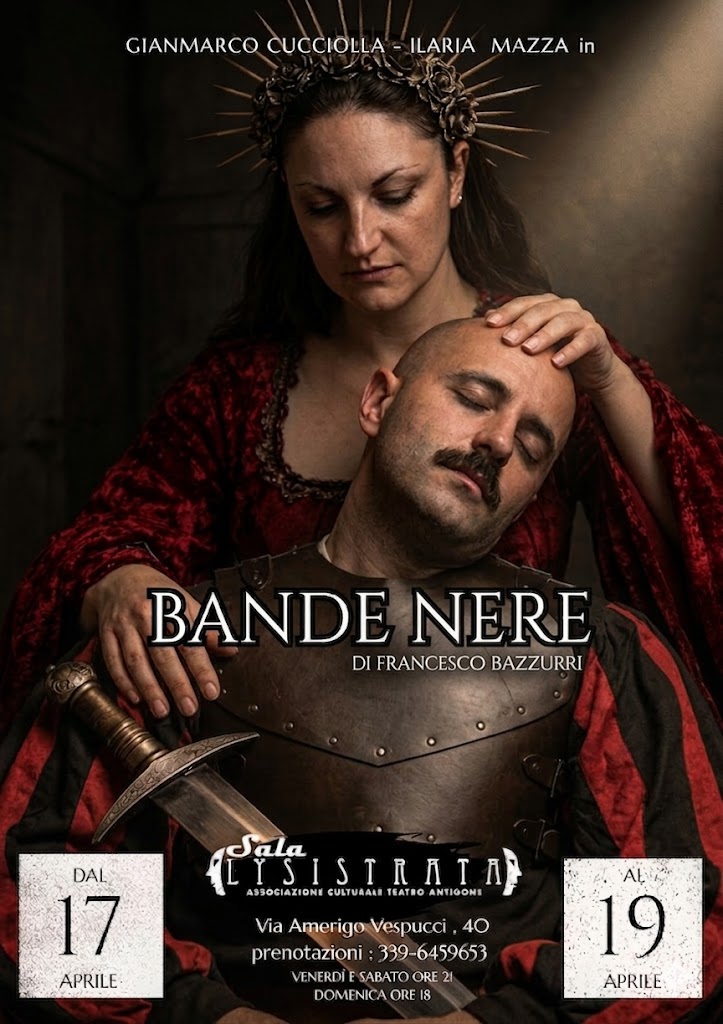 BANDE NERE. Una pièce intensa e viscerale, epica e umoristica, ispirata alla figura storica di Giovanni de’ Medici, detto “Giovanni delle Bande Nere”, ultimo grande condottiero dell’Italia rinascimentale. Giovanni dè Medici , noto anche come il “Gran Diavolo”, ripercorre la propria vita tra battaglie, visioni e subdoli tradimenti. Cresciuto sotto l’influenza della madre Caterina Sforza, diventa un combattente temuto e rispettato. In un mondo guerresco che cambia, dove l’esito di una battaglia viene ormai deciso dai colpi di cannone piuttosto che dalla forza d’urto della cavalleria pesante, Giovanni resta l’ultimo testimone di un’epoca destinata a scomparire, in cui l’ onore e il coraggio lasciano il posto all’inganno e alla vigliaccheria. Lo racconterà con un’alternanza di registri, spazianti dal farsesco al serio, dall’impegnato al faceto. Ma il vero cuore dello spettacolo è il rapporto tra Giovanni e sua madre, Caterina Sforza: un legame feroce, educativo e distorto che sfocia in un conflitto comico-grottesco, capace di generare momenti surreali e al tempo stesso profondamente umani. Questo contrasto costruisce un impianto divertente, disturbante e ricco di riflessioni sull’essere umano, sulla guerra e sulla formazione dell’identità. In scena Gianmarco Cucciolla e Ilaria Mazza, che danno vita a una partitura fisica e dinamica, dove il corpo diventa strumento narrativo e campo di battaglia.