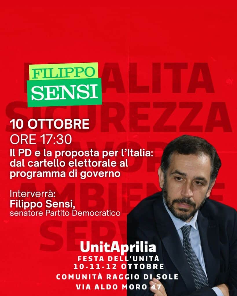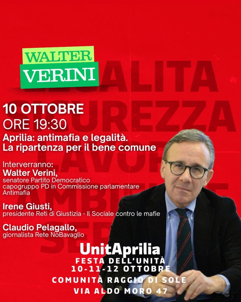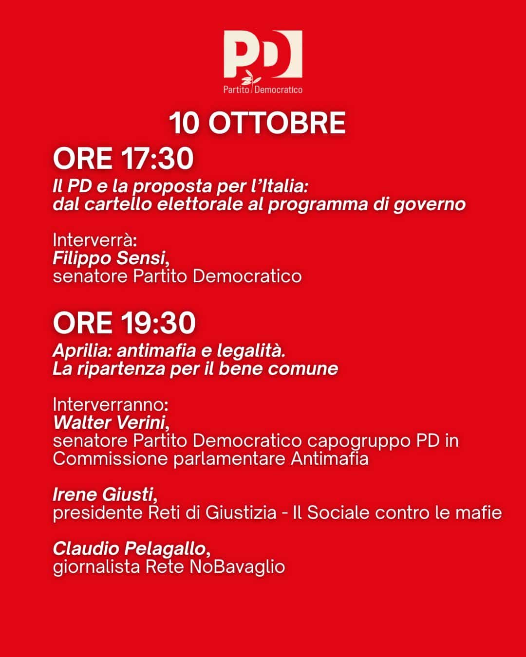 – Ore 19:30 “Aprilia: antimafia e legalità. La ripartenza per il bene comune” con il Senatore Walter Verini (capogruppo PD in commissione parlamentare antimafia), Irene Giusti (Presidente Reti di Giustizia – Il Sociale contro le mafie) e Claudio Pelagallo (giornalista Rete NoBavaglio).