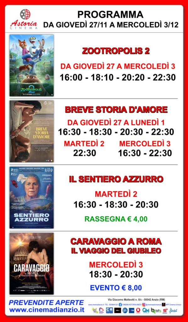 HomeRubricheCinemaCinema Astoria Anzio, i film in programma dal 27/11 al 3/12 CinemaCultura e Spettacoli Cinema Astoria Anzio, i film in programma dal 27/11 al 3/12 By Redazione 27 Novembre 2025 0 0 FacebookTwitterPinterestWhatsApp *Le notizie del quotidiano inliberauscita sono utilizzabili, a condizione di citare espressamente la fonte quotidiano inliberauscita e l’indirizzo https://inliberauscita.it Per la pubblicità su InliberaUscita tel. 3333240563 FacebookTwitterPinterestWhatsApp Articolo precedenteNettuno sostiene Delia in semifinale a X-Factor: evento speciale giovedì 27 al KinsaleArticolo successivoRiconosciuto il diritto al risarcimento del danno morale a una whistleblower Redazionehttp://www.inliberauscita.itPeriodico telematico di informazione fondato il 16 giugno 2011 Registrazione presso il tribunale ordinario di Velletri n°12/2011 Ultime Notizie Riconosciuto il diritto al risarcimento del danno morale a una whistleblower 27 Novembre 2025 Nettuno sostiene Delia in semifinale a X-Factor: evento speciale giovedì 27 al Kinsale 26 Novembre 2025 Paradiso sul Mare, Lista Turano: “maggioranza in confusione, servono trasparenza e partecipazione” 26 Novembre 2025 Violenza sulle donne. Michela Di Biase (PD): “Voltafaccia maggioranza, messaggio politico a Giorgia Meloni” 26 Novembre 2025 Un disegno e un progetto per Nettuno, venerdì 28 novembre in sala consiliare 26 Novembre 2025 Carica altri